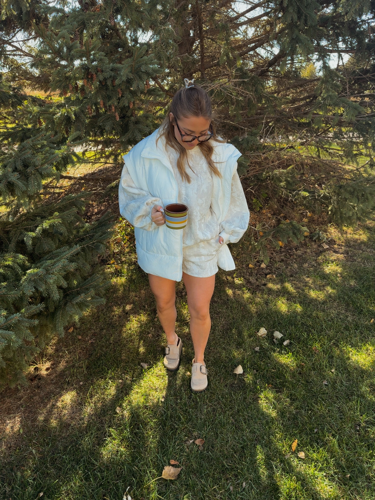 Unwind in style with the Marble Wash Lounge Set, blending a relaxed silhouette with a dreamy, nature-inspired print. - Soft, brushed fabric offers all-day comfort, while the oversized sweatshirt drapes effortlessly over the body. - Matching drawstring shorts feature an elastic waistband for a customized fit, perfect for lounging or casual outings. - The subtle marble-wash pattern in muted tones adds an elevated, artistic touch to a cozy essential.