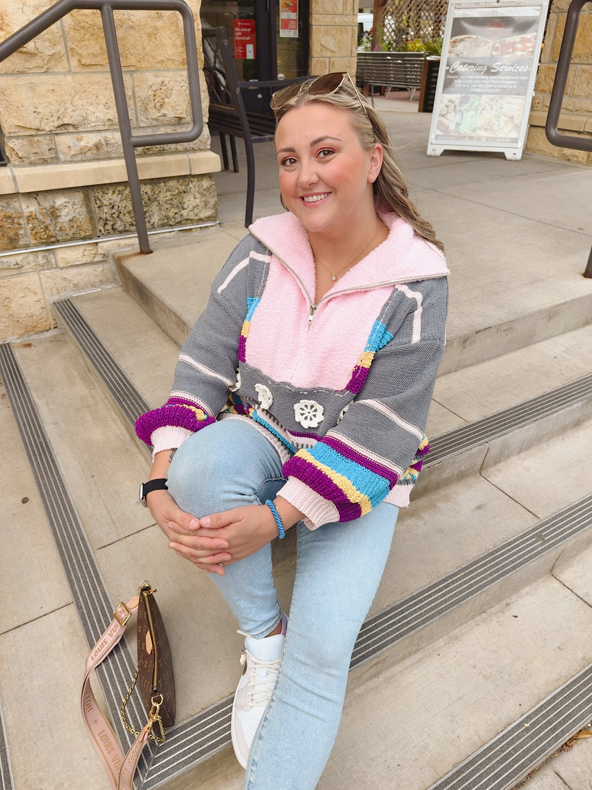 Designed in half zip up, balloon sleeve, roomy fit top in chenille sweater with outseam edge and patch detail pointed striped pattern.