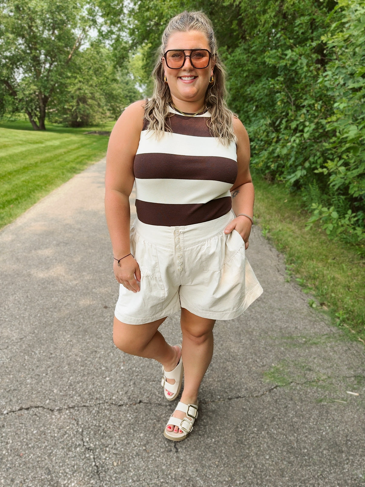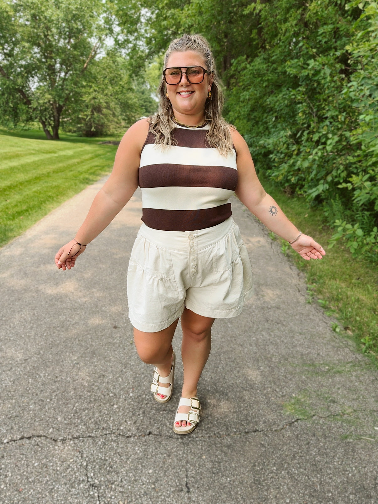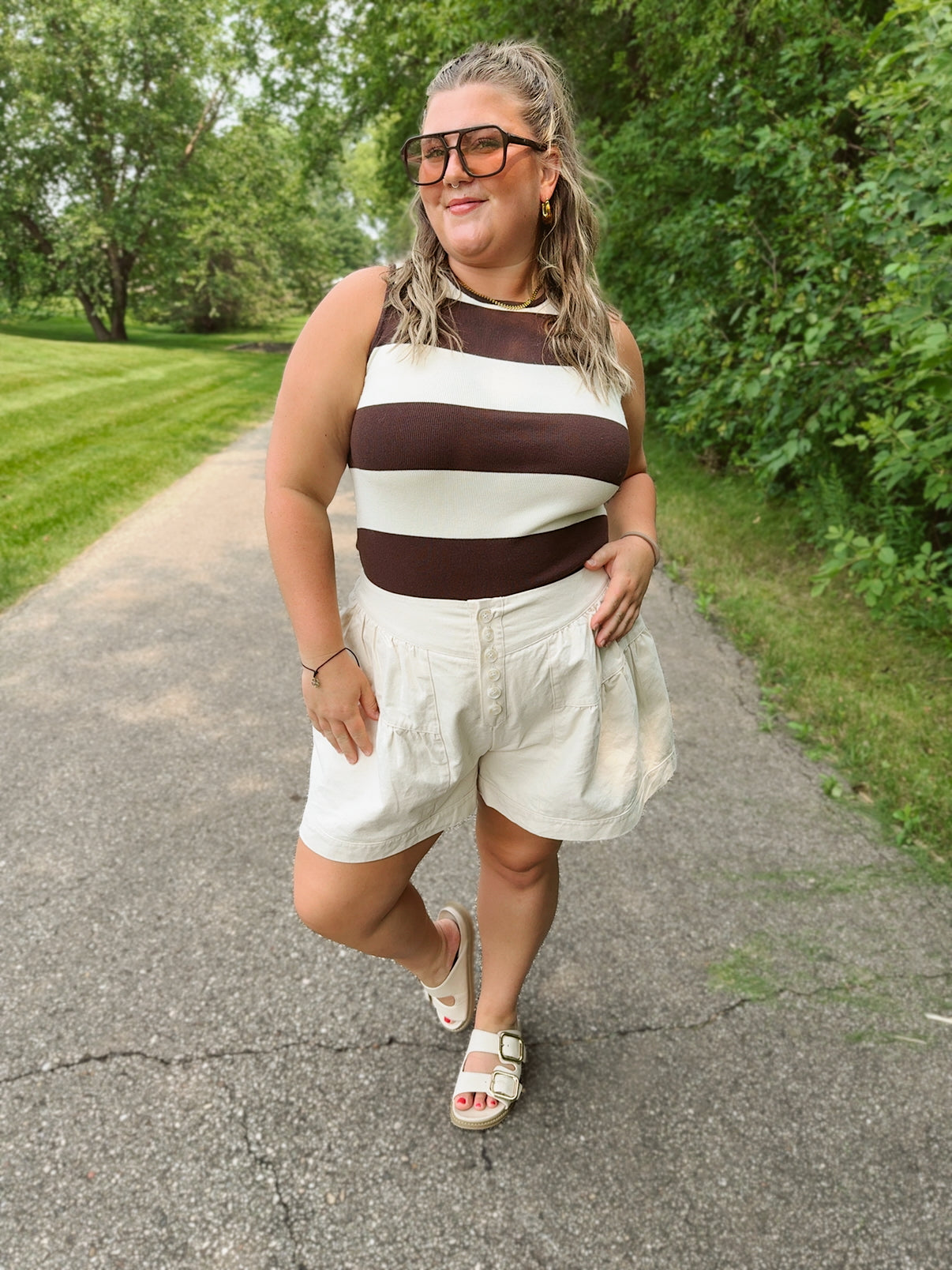 The Cream & Coco Bodysuit brings a bold and sporty edge to your wardrobe with its thick cream and chocolate brown stripes. This sleeveless, high-stretch knit hugs in all the right places while offering all-day comfort and versatility. Pair it with denim, cargos, or a mini skirt for an effortlessly cool look that transitions from day to night.