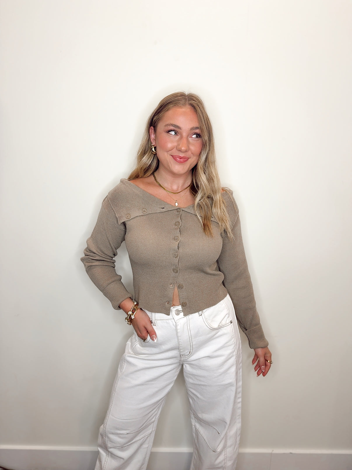 Designed with a wide fold-over neckline, this sweater can be worn off the shoulders for a romantic look or pulled up for a classic feel. The ribbed knit fabric offers a soft stretch, while the button-down front adds a timeless touch. Dress it up with tailored pants or keep it casual with your favorite denim.