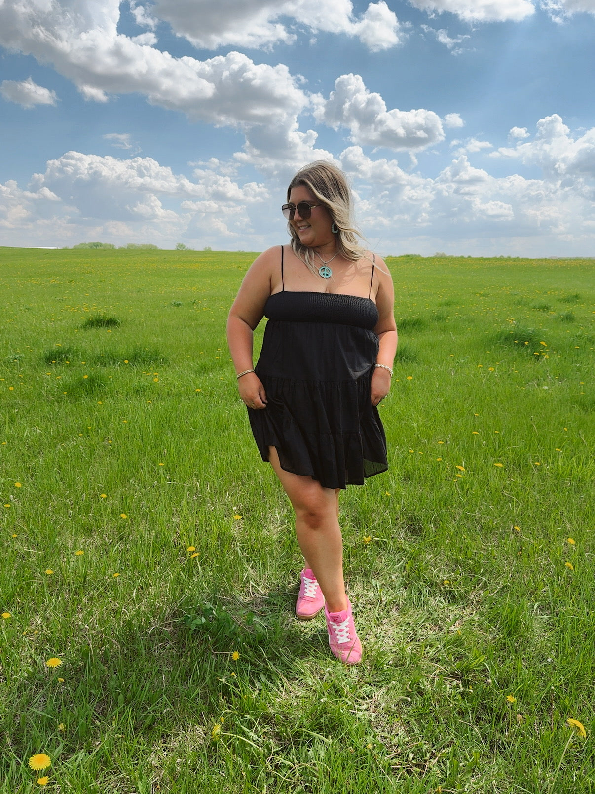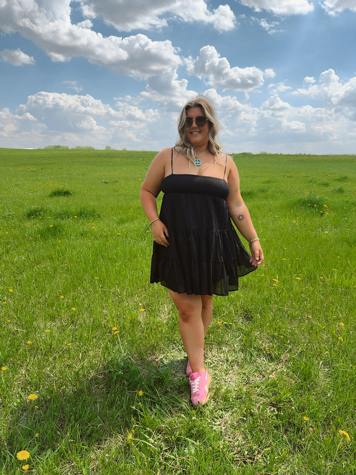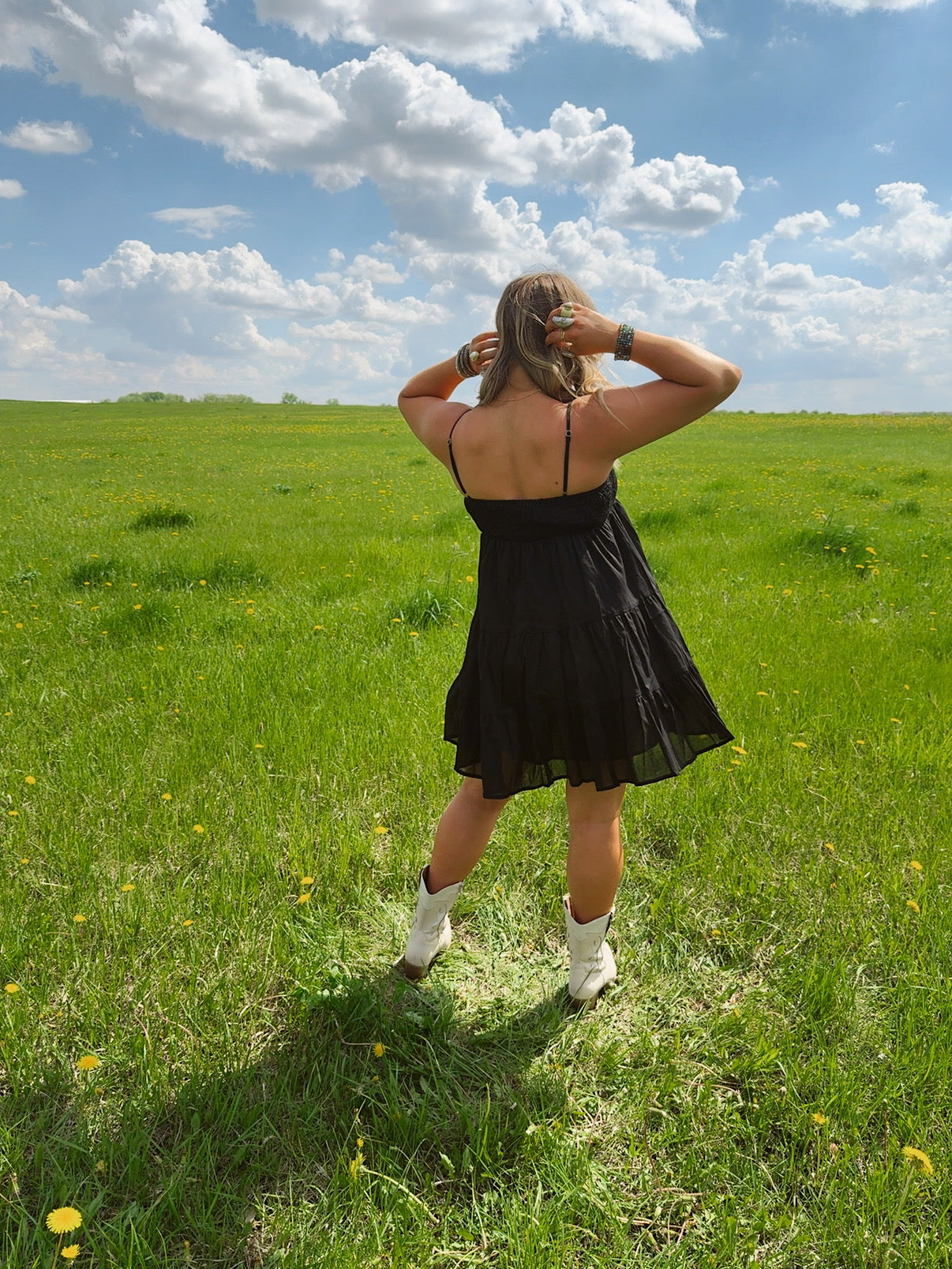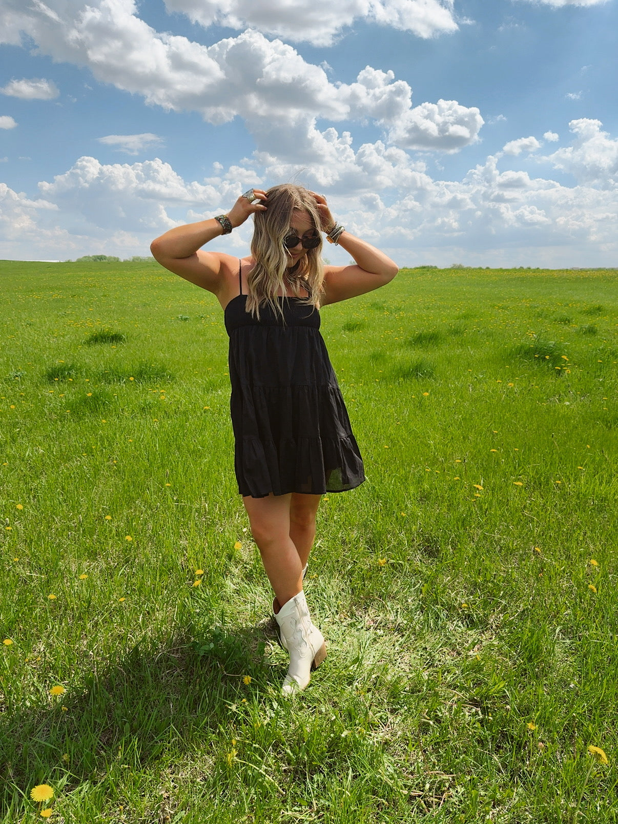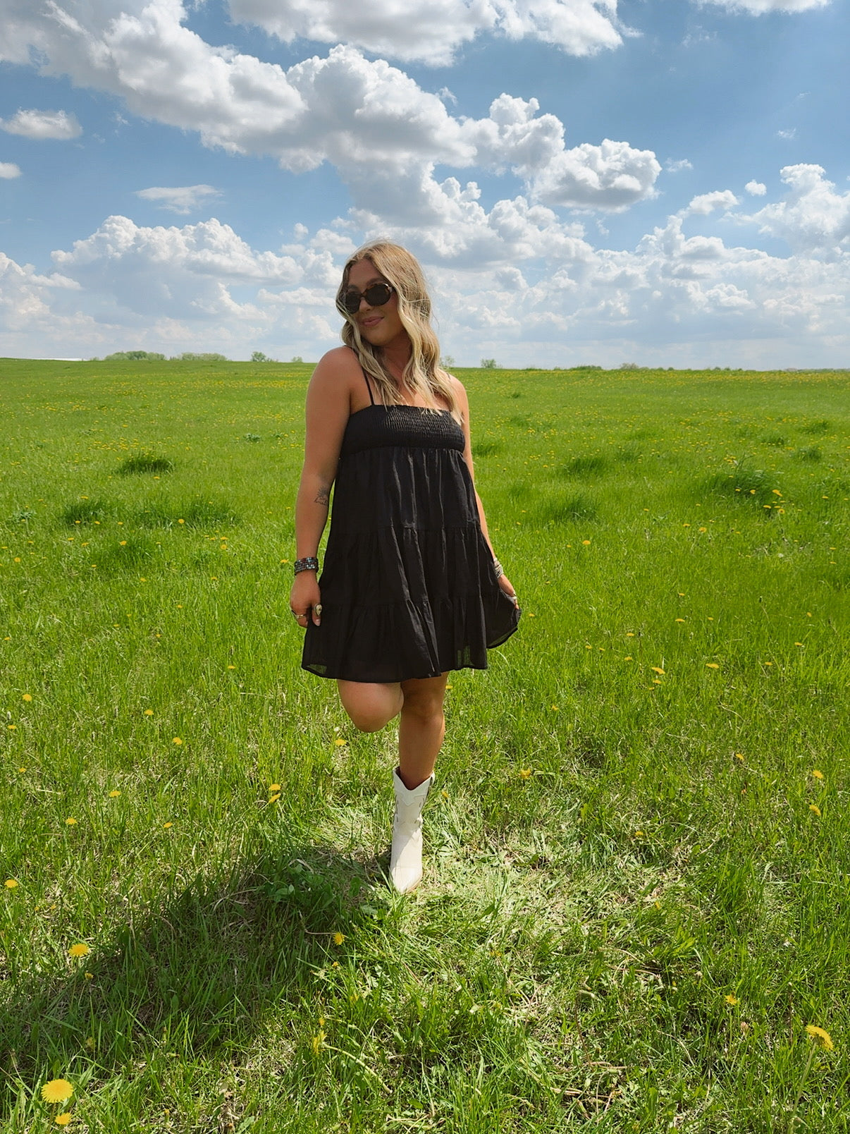 Lightweight, breezy, and effortlessly charming — the Flirt in the Dark Dress is your go-to piece for easy romance. Featuring a smocked bodice for a flattering, stay-put fit and delicate spaghetti straps, this dress flows into soft, tiered layers that move with you. The airy black fabric adds a touch of mystery while keeping things cool and flirty. Perfect for date nights, picnics under the stars, or dancing barefoot at golden hour.