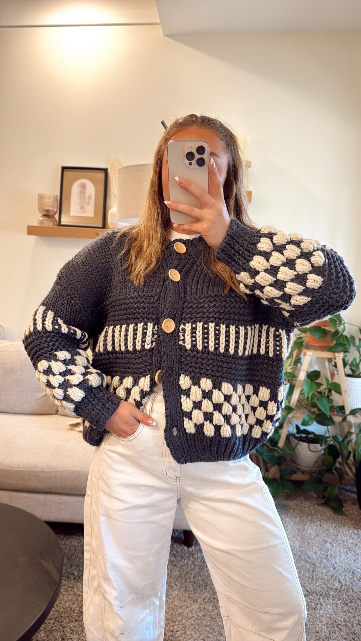CHECKERED PATTERN CHUNKY KNIT CARDIGAN 100% ACRYLIC