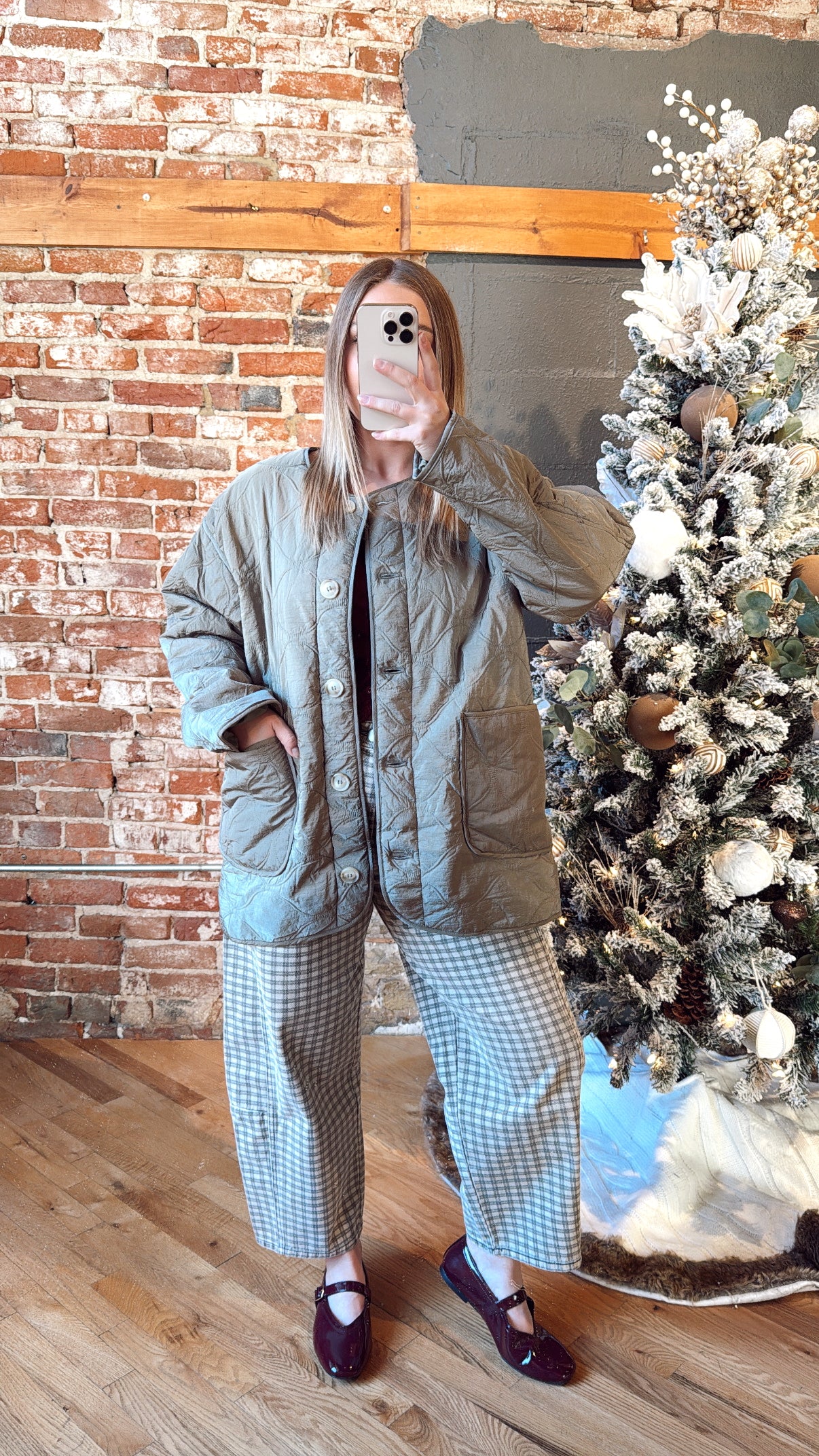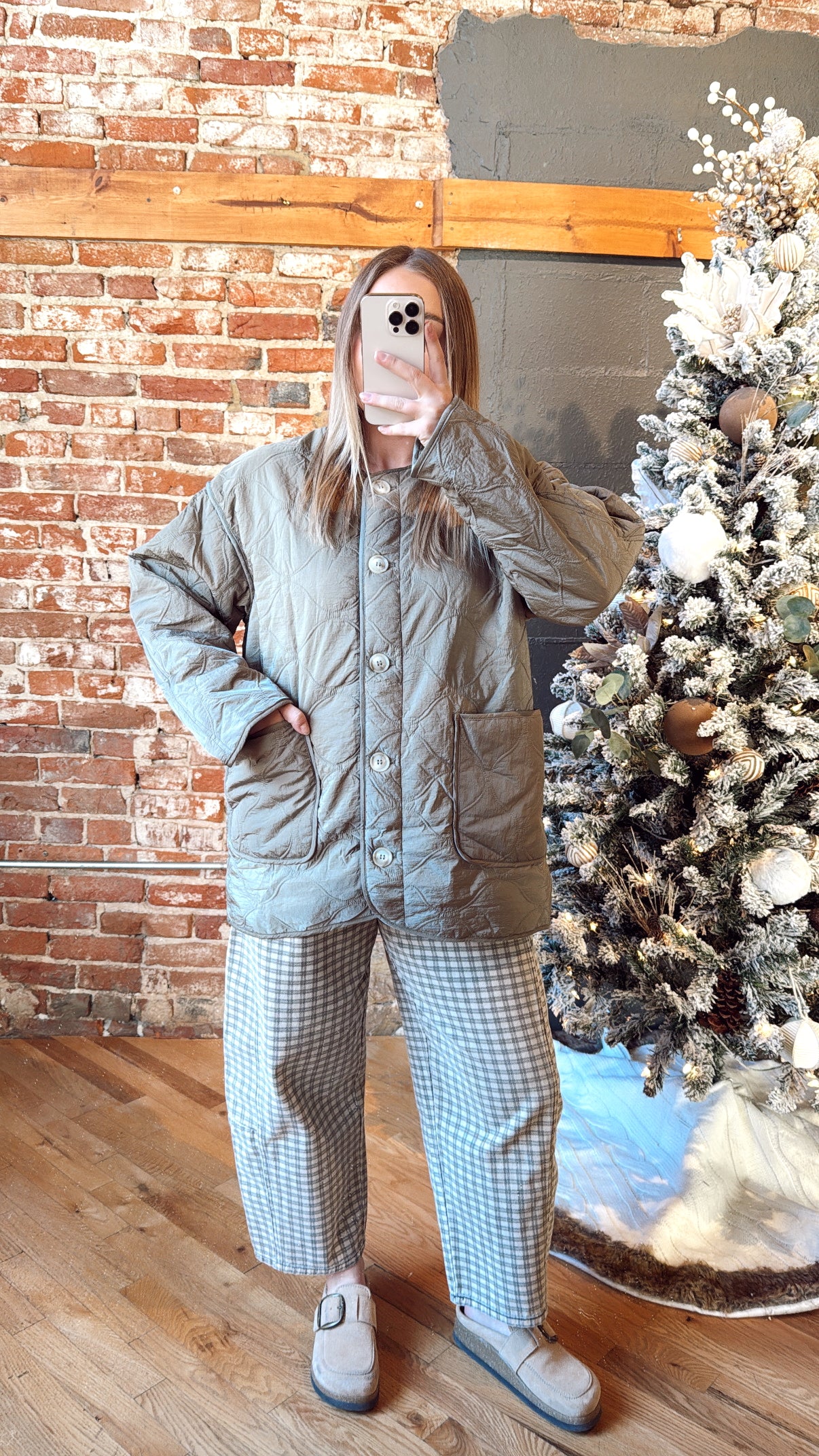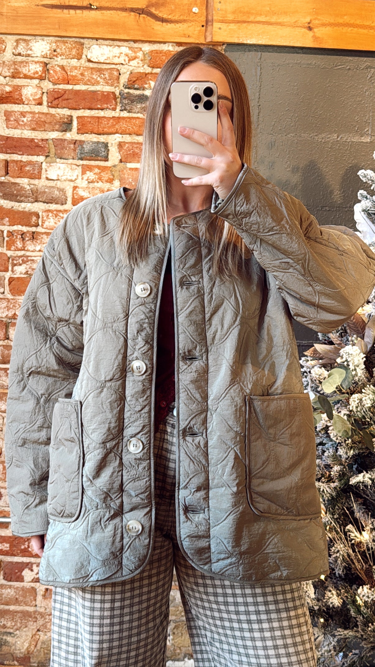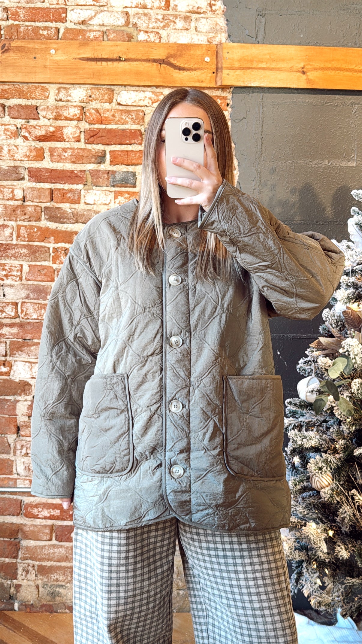 Woven Nylon Quilted V-Neck Button Down Long Sleeve Jacket With Front Pockets