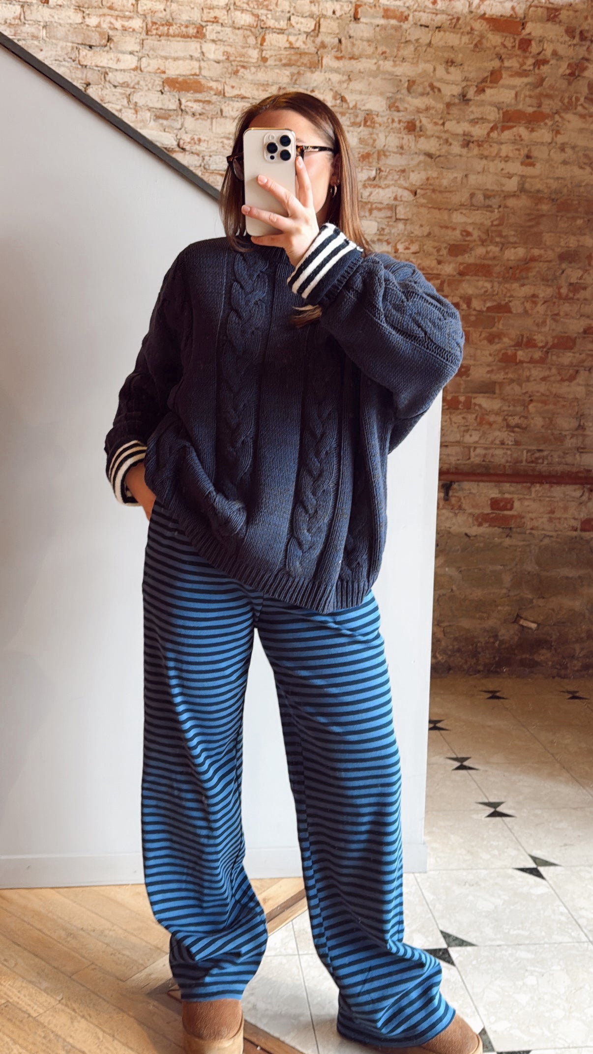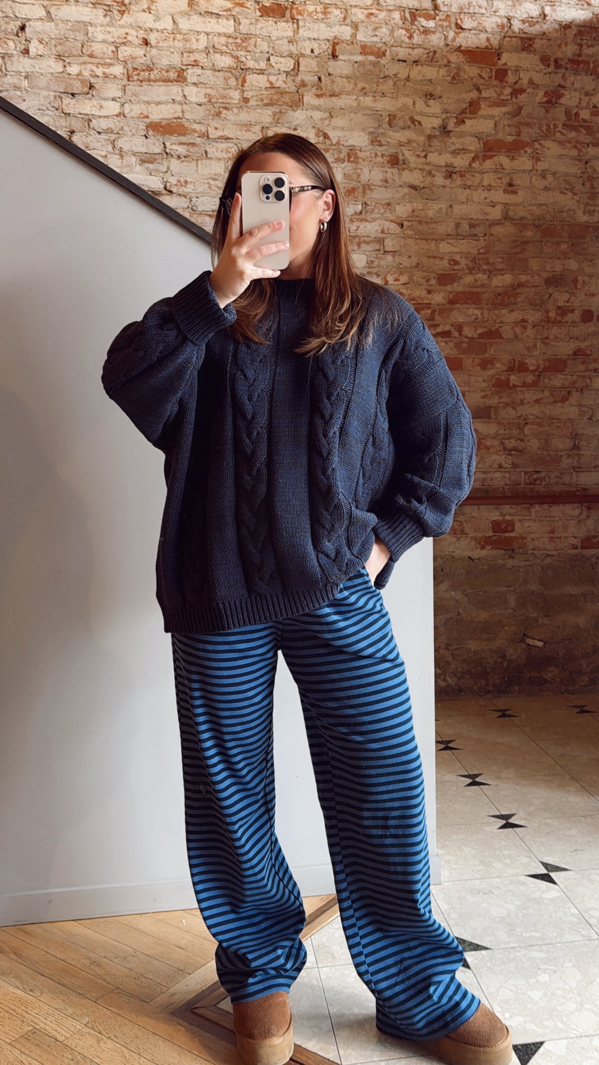 Effortless and cozy, this oversized cable knit is your everyday go-to for comfort and style. Fabric & Fit Cotton blend knit with a soft, cashmere-like touch. Mid-gauge weight for comfort and durability. Relaxed oversized fit with drop shoulders, designed for easy layering. Design Classic cable knit pattern at front and sleeves Crew neckline with ribbed finish Extended rib cuffs and hem for structure Straight back with subtle vertical knit lines Recommended Use Perfect for layering with denim or skirts, whether lounging at home or styling for a casual street look.