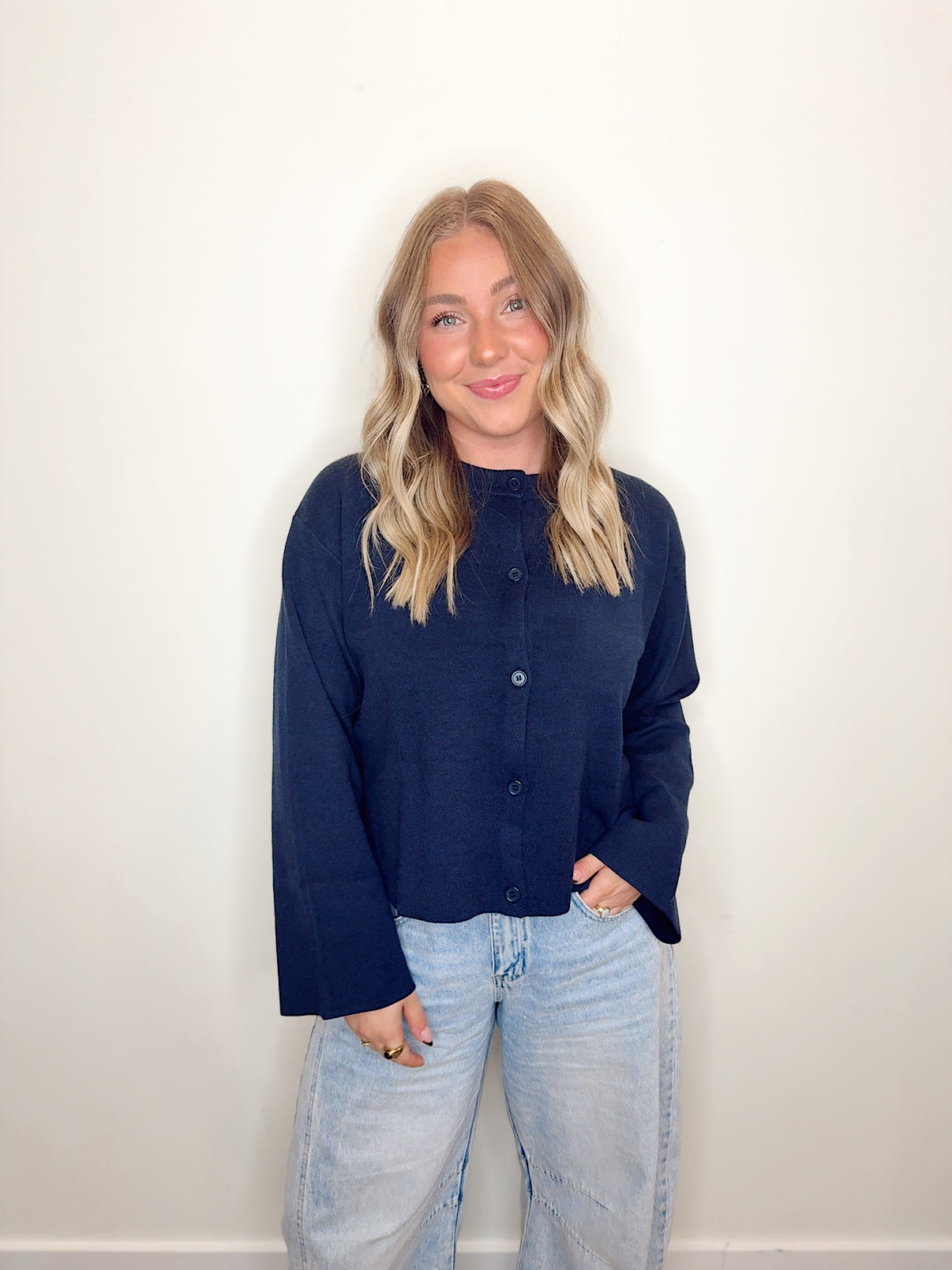 The perfect transitional cardigan — drape it over tanks, tees, or dresses for those crisp autumn days. Its indigo hue pairs seamlessly with olive tones, denim, and fall neutrals.