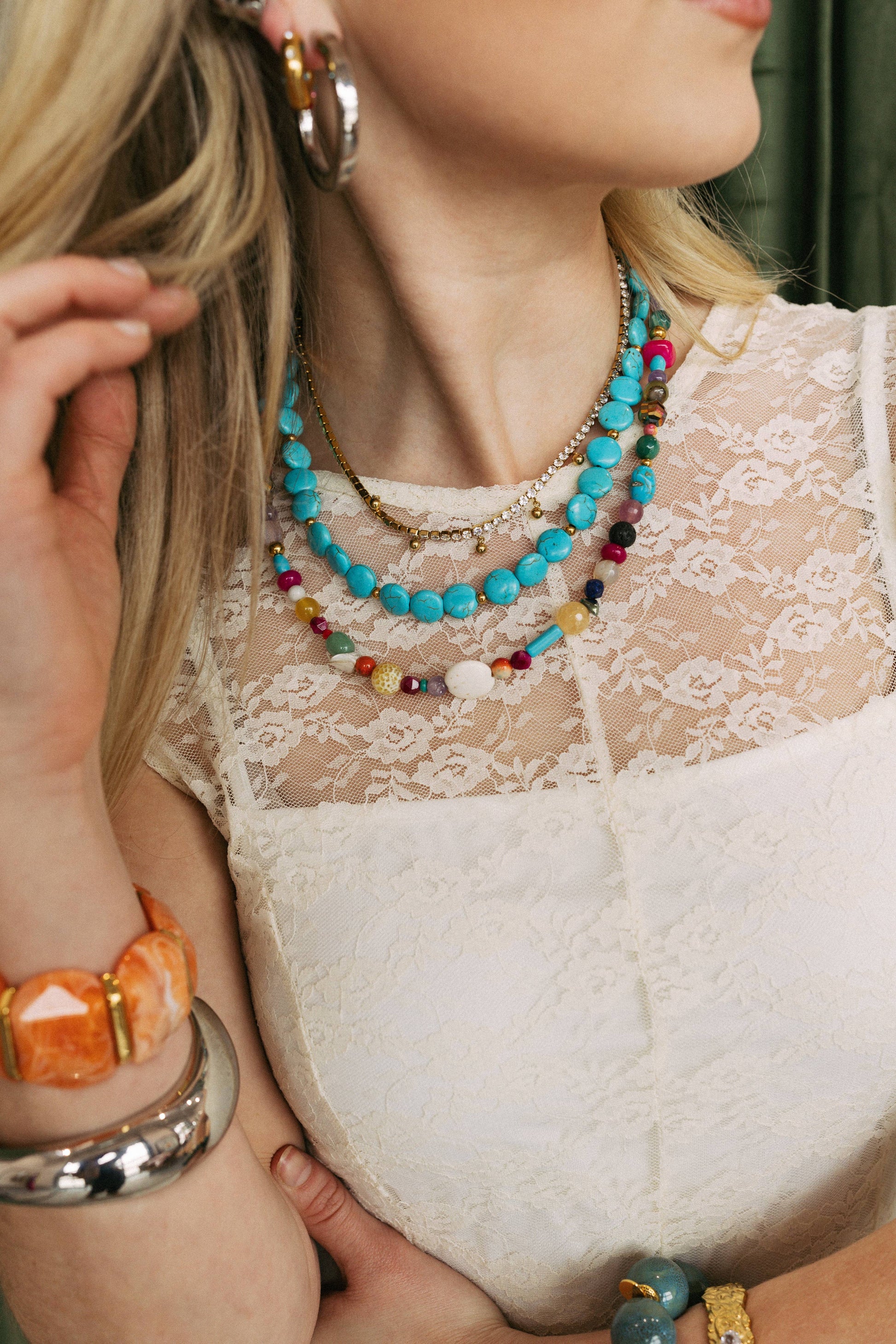 Like a party for your neckline—this necklace is full of personality with its bold hues, fun shapes, and colorful textures. Throw it on and let your jewelry do the talking! Love this vibe? Check out our Blair Colorful Beaded Bracelet!