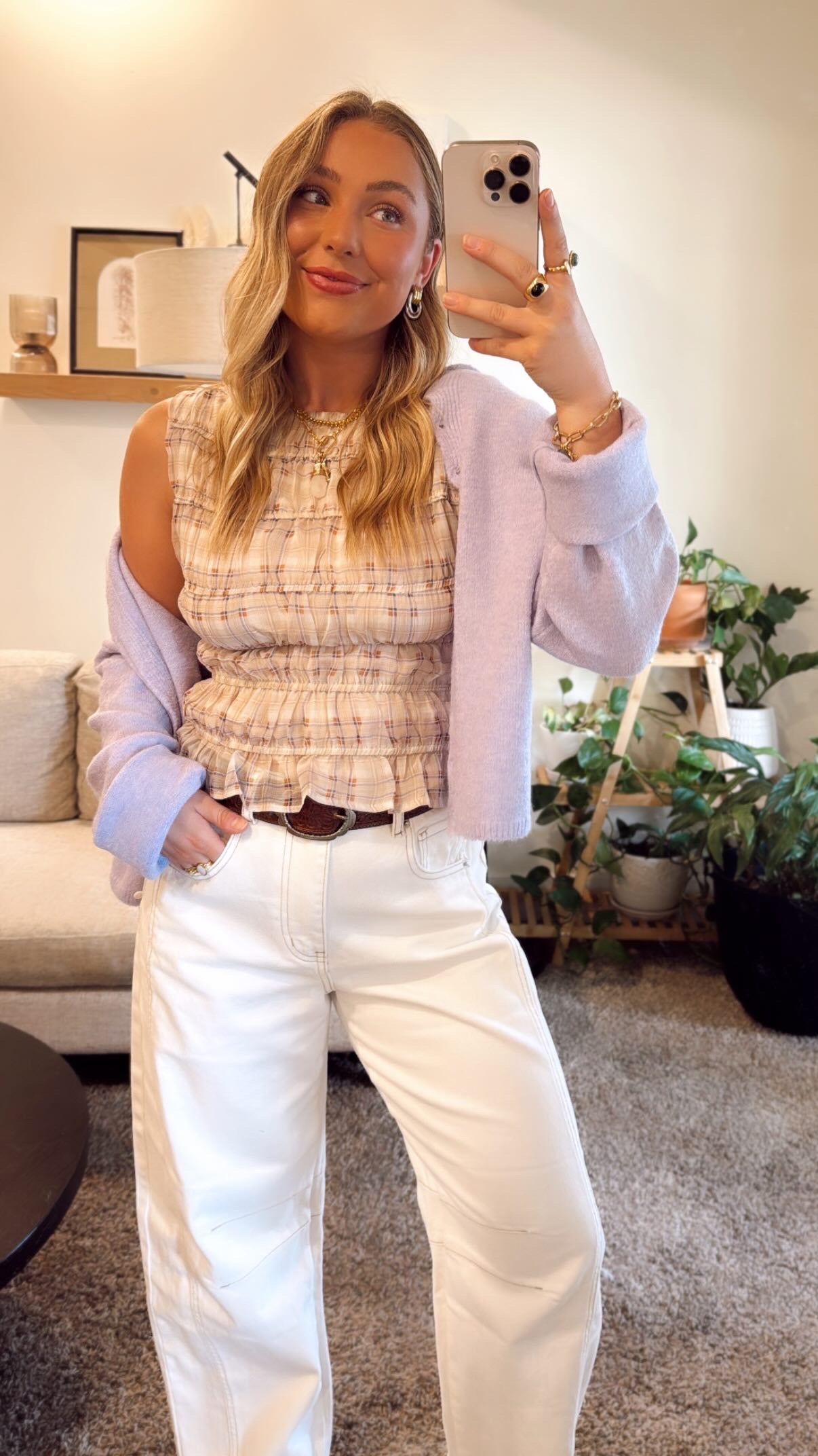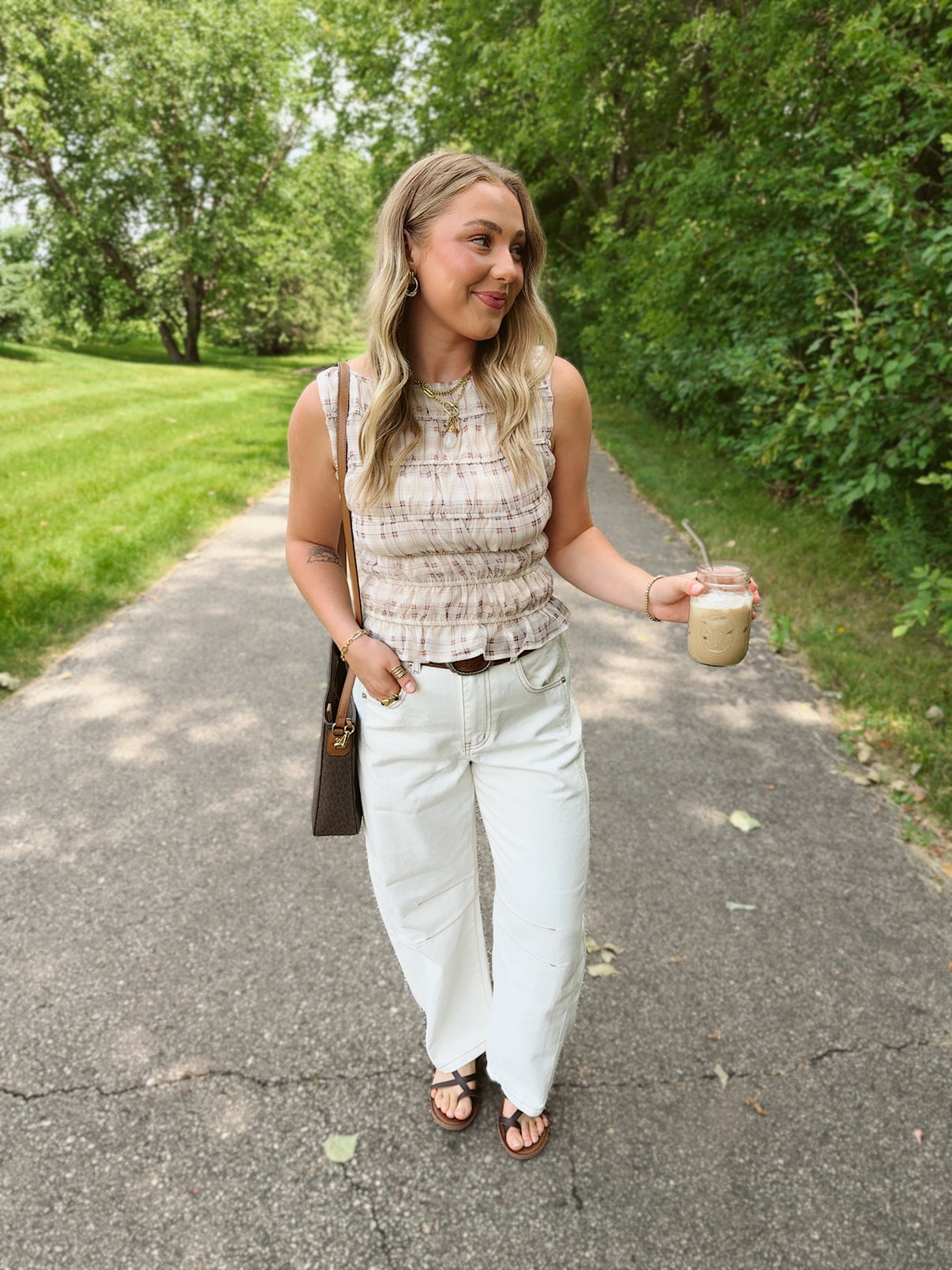A dreamy blend of soft texture and subtle pattern, the Sunset Picnic Tank is your new go-to for effortless charm. Featuring delicate ruching and a sleeveless silhouette, this lightweight plaid top flatters with a ruffled hem and gentle stretch. Perfect for warm days or layering under your favorite cardigan for cooler evenings.