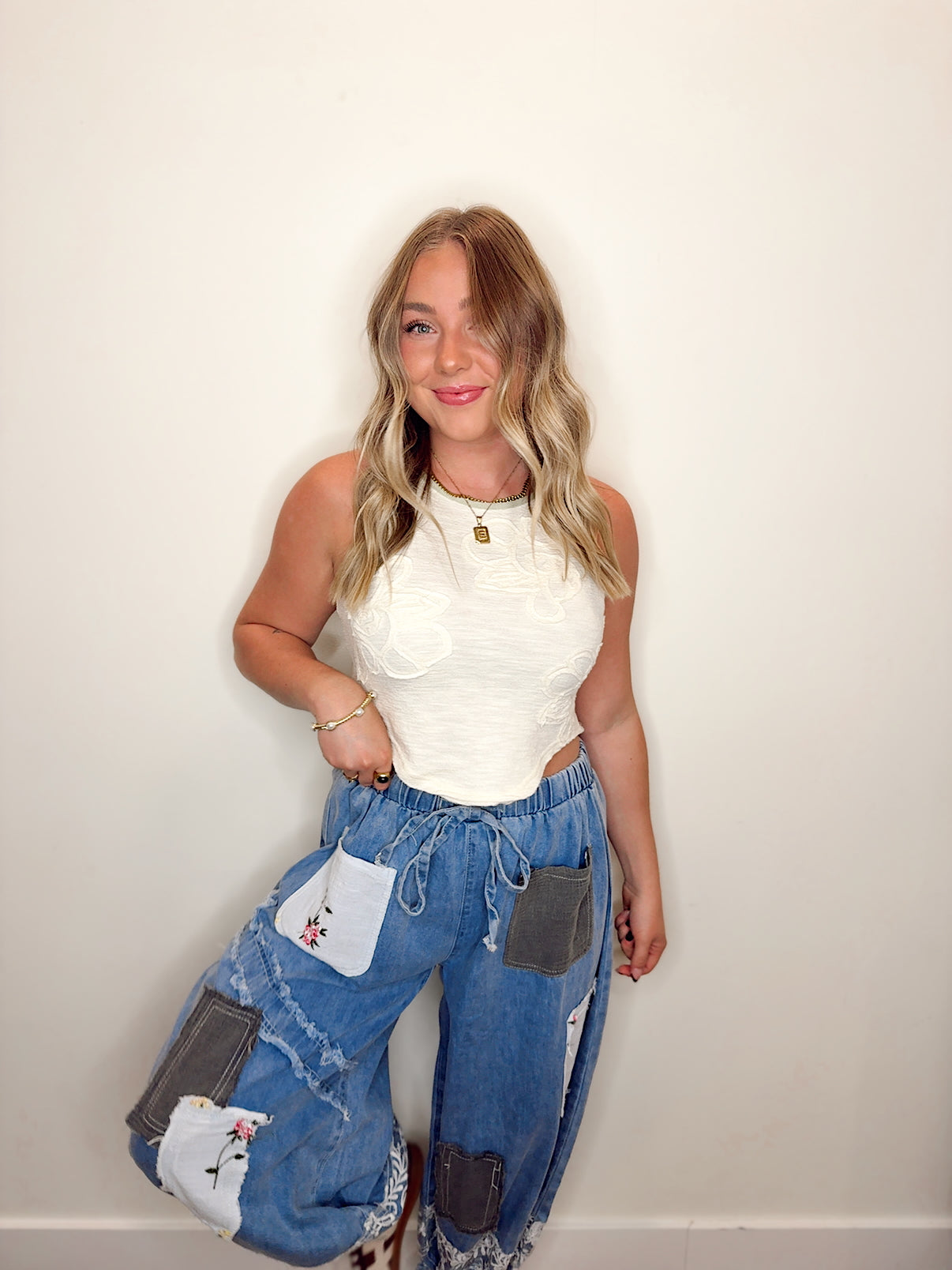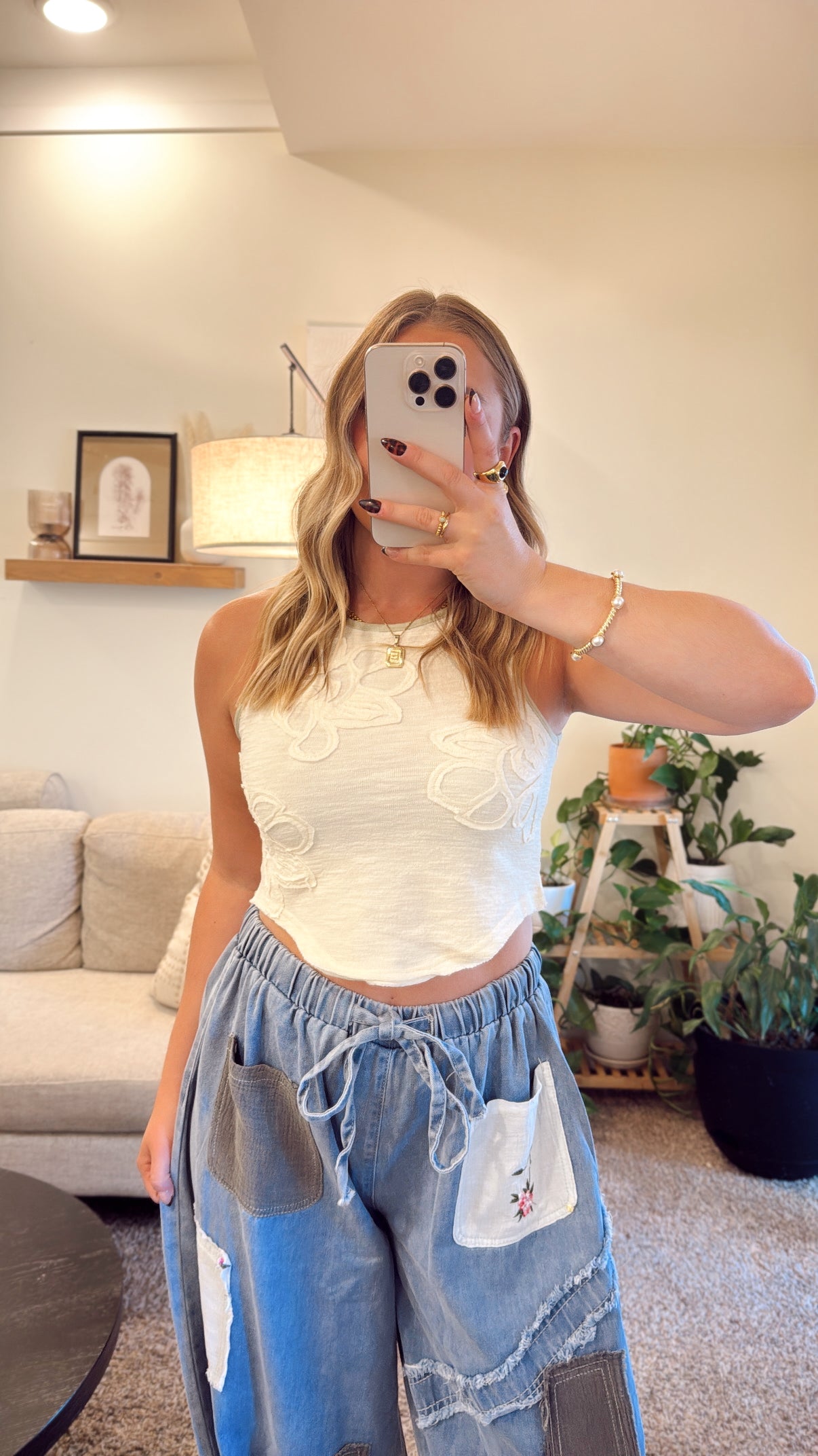 Designed in round neck, sleeveless, fitted top in textured knit with embroidered detail point solid pattern.